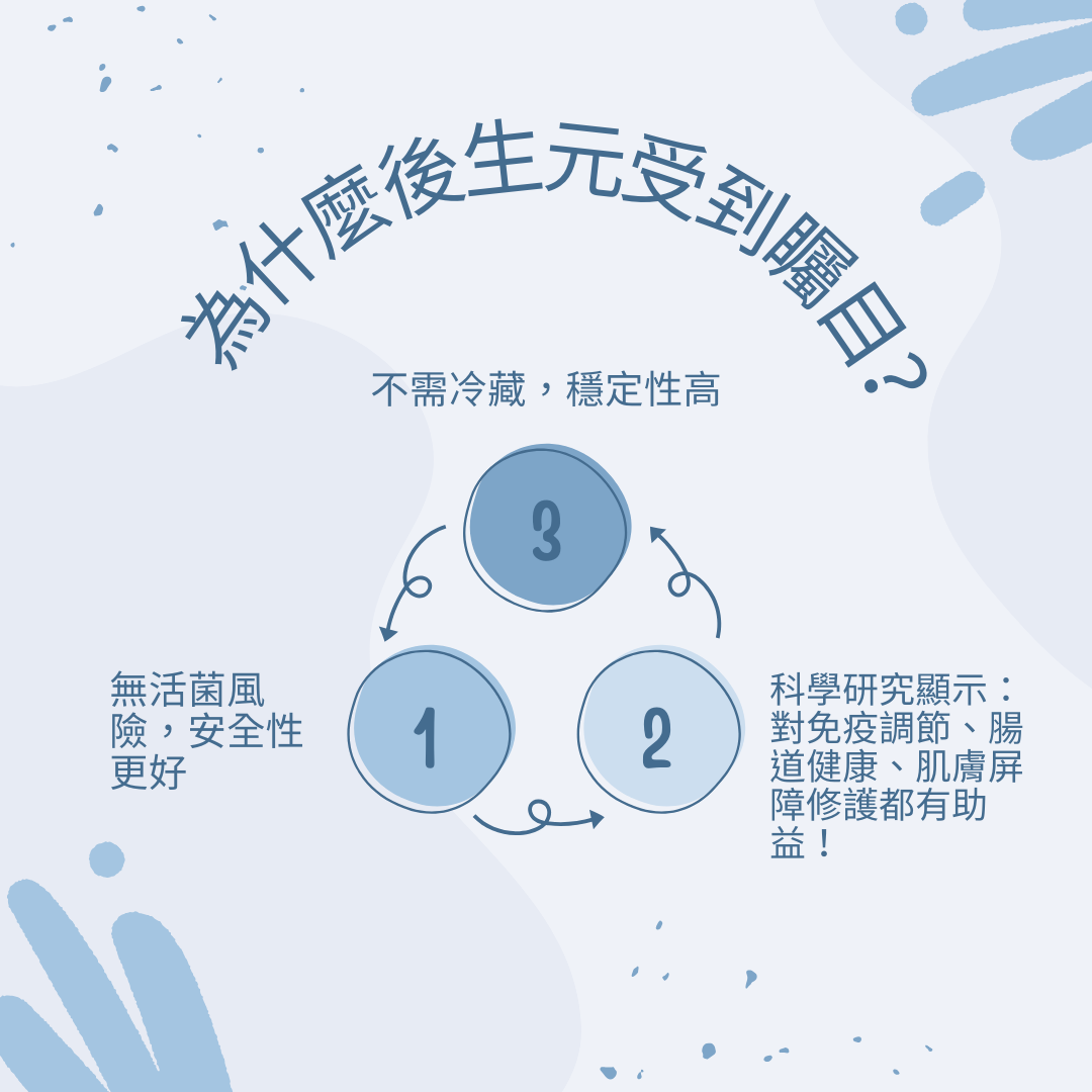 🔬 為什麼後生元受到矚目? ✅ 不需冷藏,穩定性高 ✅ 無活菌風險,安全性更好 ✅ 科學研究顯示:對免疫調節、腸道健康、肌膚屏障修護都有助益!